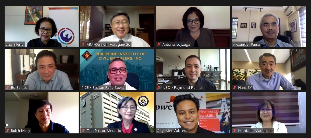 Challenge accepted! ARISE (Private Sector Alliance for Disaster Resilient Societies) PH Board of Directors convenes for the first ARISE PH Virtual Board Meeting this year. In the photo, from upper left, are Liza Silerio, PH Representative, ARISE Global; Kenneth Hartigan-Go, MD, MD (UK) School Head, Asian Institute of Management; Antonia Yulo Loyzaga, President, National Resilience Council; VAdm Alexander P. Pama AFP (ret), Consultant for Disaster Resilience, SM Prime Holdings Inc.; Ed Sunico, Vice President, Unilever Philippines; Dr. Erdsan Rene S. Suero, DPA, National President, Philippine Institute of Civil Engineers, Inc.; Raymond Rufino, Chief Executive Officer, NEO; Hans T. Sy, Chairman of the Executive Committee, SM Prime Holdings Inc.; Rene Meily, President, Philippine Disaster Resilience Foundation (PDRF); Ma. Teresita Medado, PhD, President, Asia Pacific College; Alex B. Cabrera, Chairman and Senior Partner, PwC Philippines; and, Maribeth Marasigan, President and Chief Operating Officer, Aboitiz Foundation.