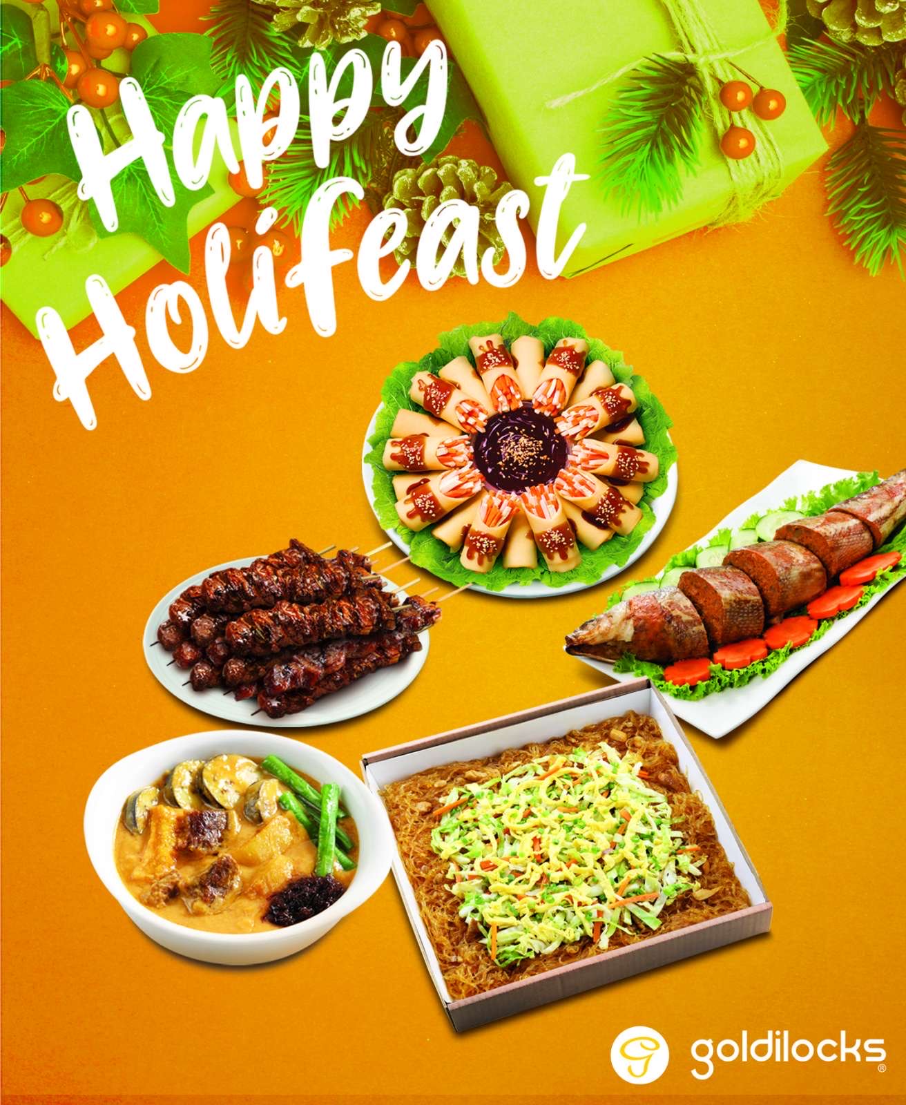 Treat your loved ones to a delicious Goldilocks feast with Sotanghon, Pork Palabok, Pork Barbeque, Pork Dinuguan, Fresh Lumpia, Rellenong Bangus, Beef Caldereta, and Kare-Kare.
