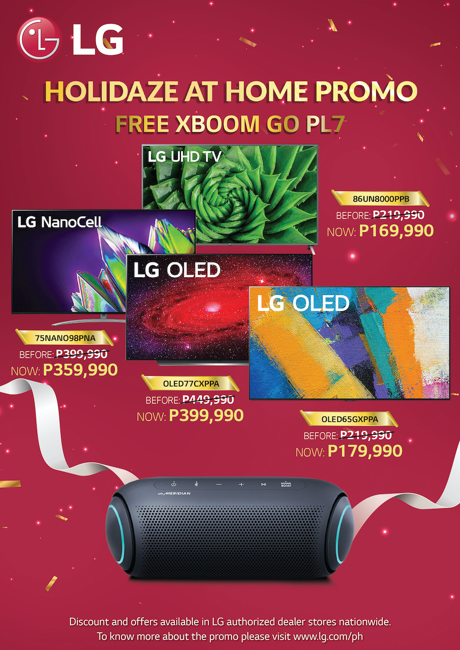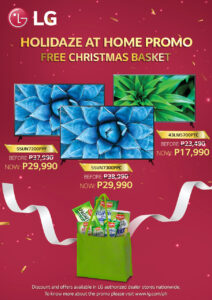 With LG’s Holidaze at Home Promo, customers can get up to 40% off and a free Christmas basket or LG XBoom Go speaker on select LG TV models. To be eligible for the promo, purchases must be made via straight card or cash payment in participating LG authorized dealer stores nationwide. LG’s Christmas baskets may be redeemed by eligible customers in participating dealer stores upon purchase.