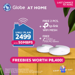 For a limited period, new and existing customers who subscribe or upgrade to Globe At Home Plan 2499 or up may avail of the TP-Link Deco M5 WiFi Mesh system with two units for free. This promo is available until October 31, 2020 only. Additional mesh devices can also be purchased for a monthly fee of P150 per unit for 24 months.