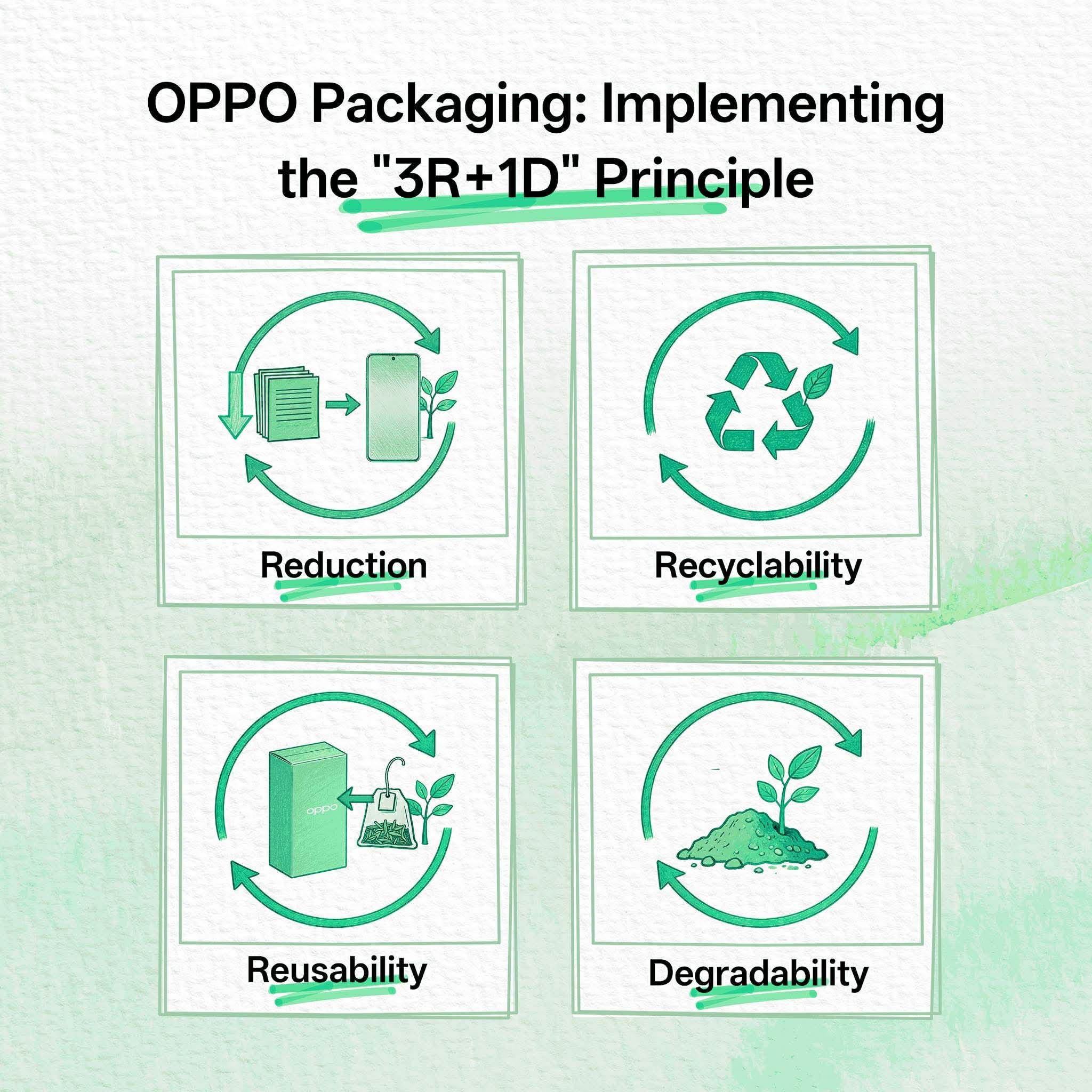 Excessive packaging has become a widespread environmental challenge for the consumer goods industry. OPPO has introduced the “3R+1D” principle of Reduction, Recyclability, Reusability, and Degradability into its packaging, promoting more sustainable packaging through upgrades to both processes and materials.