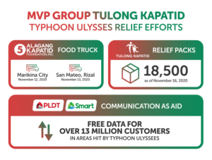 MVP Group’s umbrella corporate social responsibility initiative Tulong Kapatid (TK) has so far distributed at least 18,500 relief packs to affected residents from various provinces hit by the series of storms in as many weeks— from this year’s most powerful storm in the world Rolly (international name: Goni) to Ulysses (international name: Vamco), which flooded communities in Isabela and Cagayan.