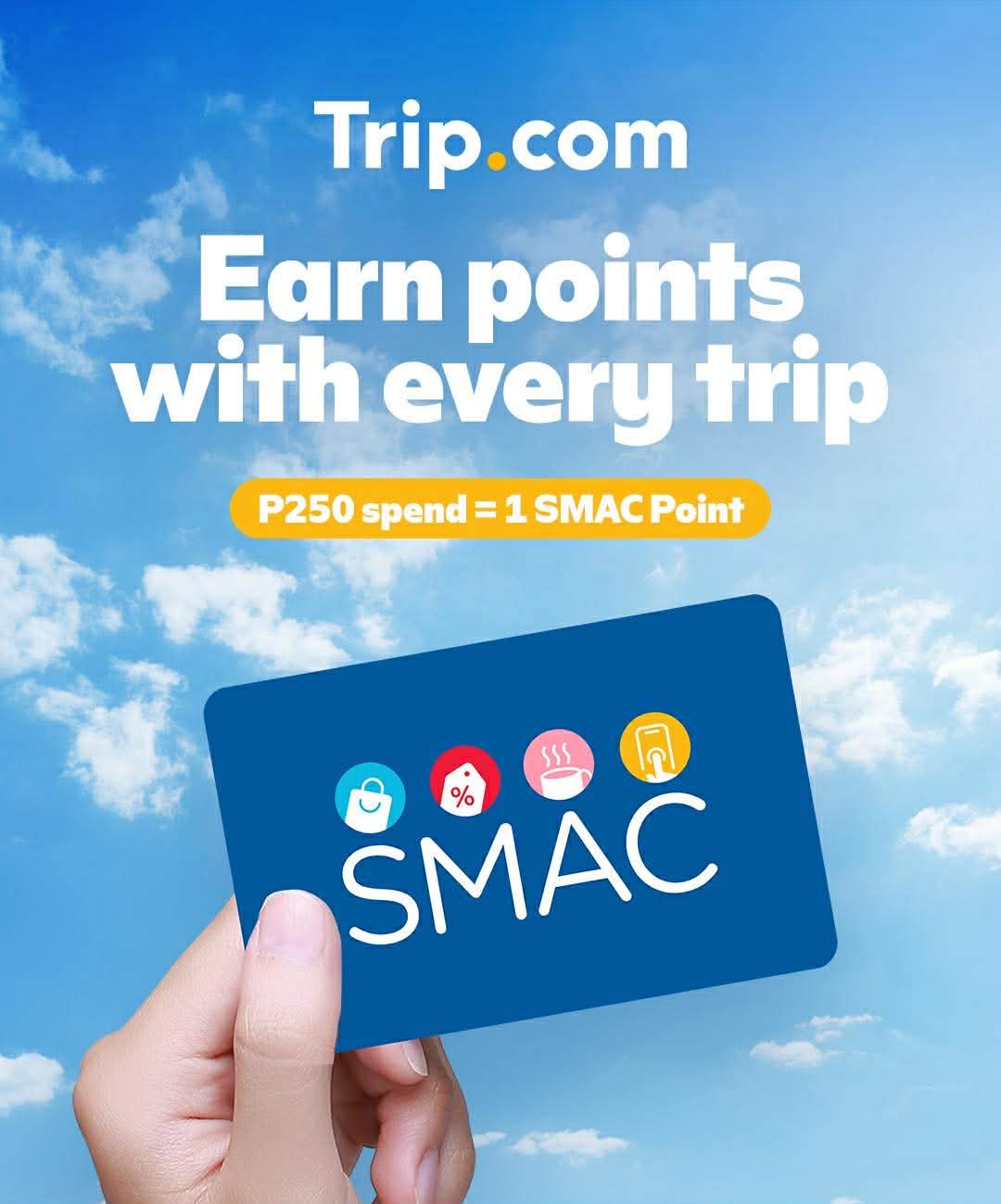 Under the partnership, SMAC members can earn 1 SMAC Point for every PHP250 spent on hotel and flight bookings made through Trip.com. Points will be credited within 60 working days after completion of your Trip.com booking (i.e., after your hotel stay or flight).